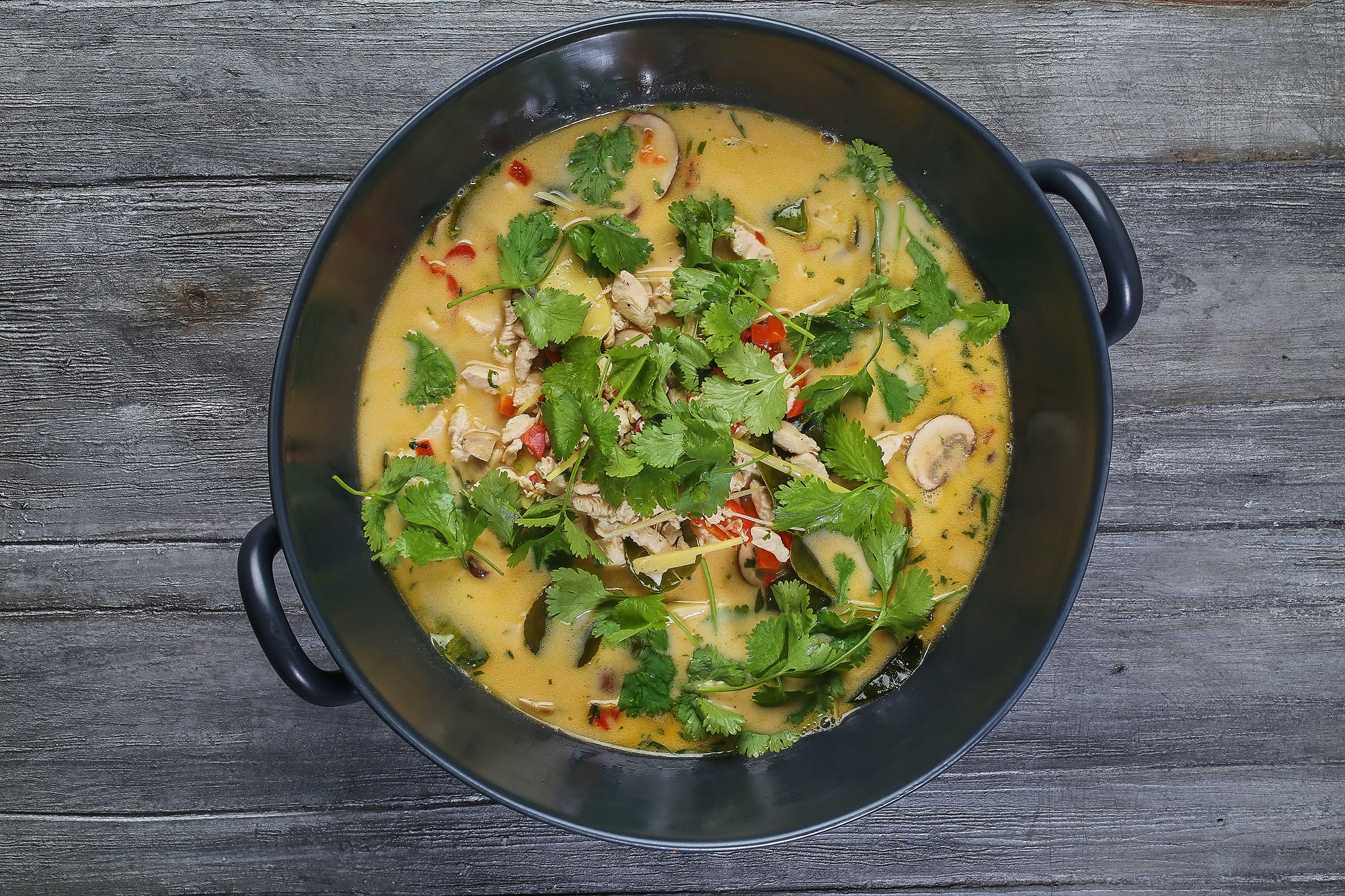 Tom kah gai - Thailandsk kokossuppe er en hot (chili), aromatisk (galanga & citrongræs) let sødlig (kokosmælk og sukker), salt og umami (fish sauce) samt syrlig (lime) suppe der ender ud som en skøn harmonisk smagsbombe! Smag dig frem og vær ikke bange for at krydre til kant!