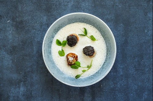 Skagenfoods egen signature cremede fiskesuppe med karamelliseret kammusling, sort trøffel og ærteskud