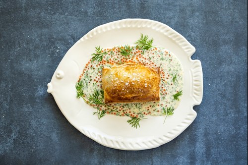 “Wellington” af mousseline af perlehøne og letsaltet torskeryg og spinat bagt i sprød butterdej med blanquettesauce mættet med Ikura ørredrogn, dild og purløg dertil grøn salat Mesclun med vinaigrette